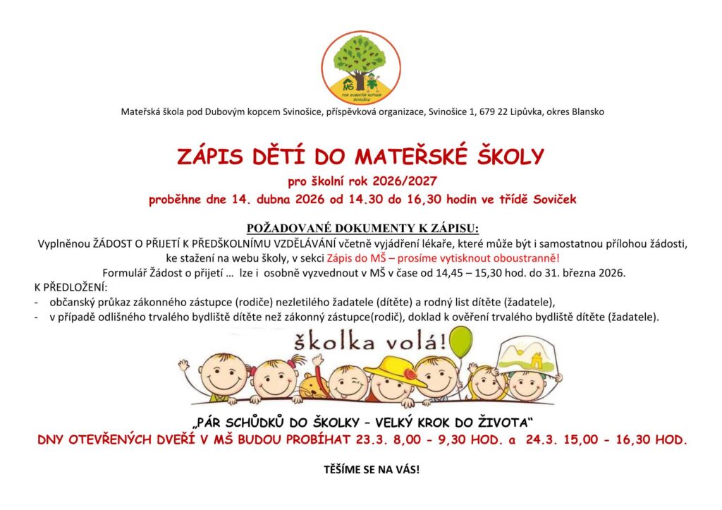 Formulář Žádosti lze vyzvednout přímo v mateřské škole v čase od 14,45 do 16,00 hod., do 31. dubna 2026.